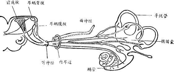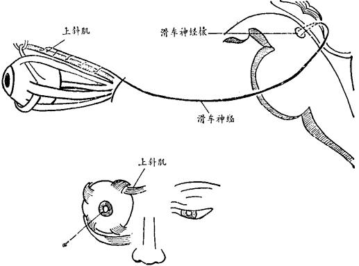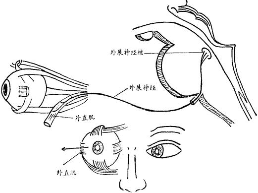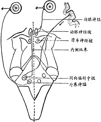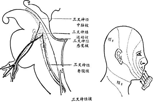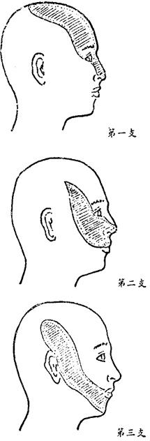 图37 向右同向偏斜机理图 (四)三叉神经: 1.感觉部分:三叉神经的眼支、上颌支、下颌支分别分布于额部、面颊与下颌区,检查其有无感觉障碍,核性损害则呈同心圆型感觉障碍(图38,39)。