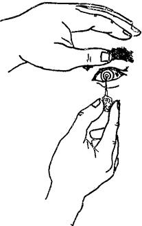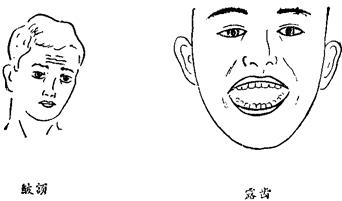 图40 角膜反射 (五)面神经: 1.运动部分:鼻唇沟深、浅,口角偏斜向何侧,能否作鼓气、露齿、吹口哨等动作,对称否,睑是否能紧闭,抬眉时有无皱额动作(图41、42)。