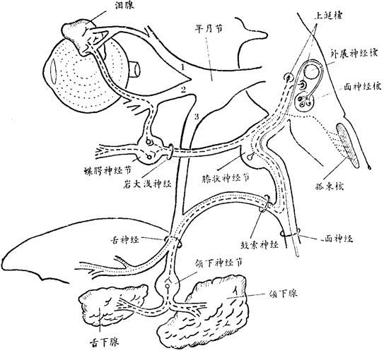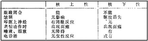 图42 面神经检查法 2.感觉部分:舌前2/3味觉(苦、咸、甜、酸味)。 附:核上性、核下性面瘫鉴别表