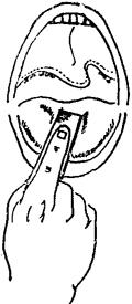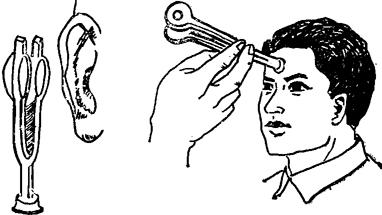 图44 听神经音叉检查法 5.旋转试验:头前倾15°,以每秒旋转一周速,转10次,观察向左、向右旋转后的眼球震颤方向与伴随症状,如恶心、呕吐、眩晕等。 6.冷水试验:用13℃冷水5毫升,接橡皮小管,缓慢冲激鼓膜,15~30秒后可出现向对侧的旋转性眼球震颤,持续60~90秒钟,若无反应,可增至10毫升冷水,再次冲激观察,如渐增至25~90毫升时仍无眼球震颤,示前庭机能已破坏。 冰水注入法:于20秒内注入冰水2~4毫升,30秒后,可出现眼球震颤,持续100秒。 (七)舌咽、迷走神经:检查病人的软腭上提运动(嘱病人发“啊”音),观察其悬壅垂有无偏斜(病时偏向健侧),以及声带发音情况;检查舌后1/3味觉以及吞咽反射(图45、46、47)。