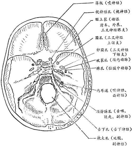 图4 颅底孔与有关的颅神经 (一)颅前窝:两侧为眶顶,其下为眶腔,中央为鸡冠和筛板,板上有许多小孔,嗅神经和筛前动脉由此通过。大脑的额叶占据此窝。 (二)颅中窝:此窝内骨孔、裂缝较多,大脑颞叶所在。中央部是蝶骨体的上面,叫蝶鞍,蝶鞍上的凹陷叫垂体窝,容纳脑垂体,其下是蝶窦。鞍旁是海绵窦,颈内动脉由破裂孔入颅后,穿经此窦。脑膜中动脉由棘孔入颅。其他有视神经孔(视神经、眼动脉通过此孔)、眶上裂(动眼、滑车、外展和三叉神经眼支通过)、圆孔、卵圆孔(三叉神经上颌及下颌支通过的孔道)等。 (三)颅后窝:主要由枕骨下部构成。中间为枕骨大孔,下通椎管。枕骨大孔前方为枕骨斜坡,是脑干所在。脑干经枕大孔与脊髓相连。枕大孔前外侧有颈静脉孔,舌咽、迷走、副神经由此出颅。颈静脉孔上方有内耳孔,面神经与听神经由此通过。舌下神经由靠近枕大孔缘的舌下神经孔出颅。此窝内有一弯曲状的乙状沟,此沟后上端连于横沟,左右横沟在中线汇合,为乙状窦和横窦的所在。 |