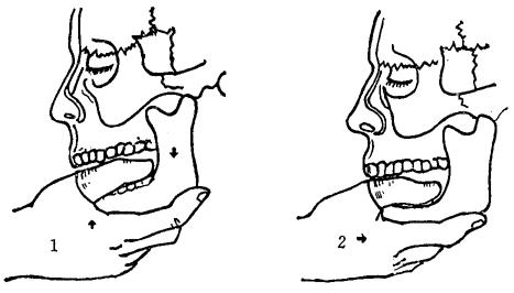 【整复方法】 伤员正坐靠背椅上。术者面对伤员,将两手拇指用纱布缠绕,伸入口腔,分别按压于两侧臼齿咬合面上,两手四指分别托住颏部及下颌角。拇指用力向下方按压(图13~1),力量由小逐渐加大,当感到下颌骨游离松动时,说明双指压力已胜过嚼肌的收缩阻力,此时将下颌骨体向后上方端送,即可复位。