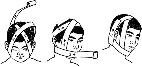 图13~2 颞颌关节脱位绷带固定方法