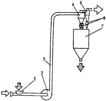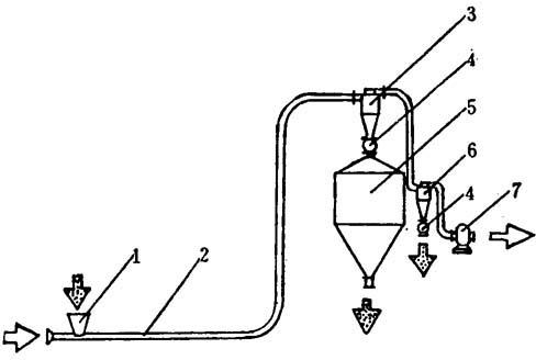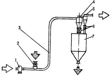 图6-2-79 压力式风送流程 1-罗茨鼓风机 2-格仓加料器 3-运输管道 4-旋风分离器 5-二次旋风器 6-格仓封风器 7-料缸 压力式风送的特点如下: ①可将草片等物料由一处向几处分散输送。 ②适于长距离,大容量输送(250t/h)。 ③输送压力可以在最高额定压力内变化。 ④分离器、除尘器,不需要装密封器。 ⑤输送压力高时,供料器上部的料罐要做密封式结构,每个料罐只能作间歇式的输送。 压力风送的型式有下面两种: ①低压风送工作压力在50kPa,气压机械常用高压双级鼓风机、罗茨鼓风机、透平鼓风机。 ②高压风送工作压力可达700kPa,常用压气机械往复空气压缩机或螺杆压气机。 (3)压送、吸引混合式风送 ①压吸风送流程见图6-2-80。