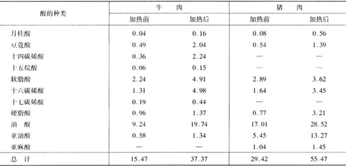 | 释义 | 风味的变化 生肉的香味很弱,但是加热后产生很强的特有风味。一般认为,这是由于加热导致肉中的水溶性成分和脂肪的变化造成的。加热肉的风味变化与氨、硫化氢、胺类、羰基化合物、低级脂肪酸等有关。对风味的本质,已经进行了相当广泛的研究。就现阶段的认识,在肉的风味里有共有的部分,也有因肉种类不同而特有的部分。前者主要是水溶性成分,譬如加热脂肪含量很少的肌肉时,对牛肉和猪肉所得的肉的风味物质大致相同,可能是氨基酸、肽和低分子碳水化合物之间进行反应的一些生成物。后者则是因为不同种类的脂肪和脂溶性物质的不同,由加热而形成的特有风味。如羊肉的不快气味就是由辛酸和壬酸等中级饱和脂肪酸所致。表2-4-2所示为加热前后猪肉和牛肉的游离脂肪酸的情况,可以看出其显着不同。 表2-4-2 加热时游离脂肪酸的变化 单位:mg/g