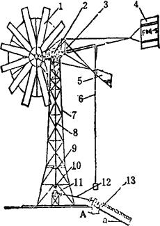 1-风轮 2-上变速箱 3-机头 4-机尾 5-侧翼 6-滑轮配重机构 7-塔架 8-垂直传动轴 9-木轴承 10-联轴节 11-下变速箱 12-水平传动轴 13-螺旋泵