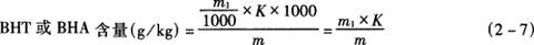 式中 m——待测溶液BHA(或BHT)的质量,mg hi——注入色谱样品中BHA(或BHT)的峰高或面积 hs——标准使用液中BHA(或BHT)的峰高或面积 Vi——注入色谱样品溶液的体积或面积 Vm——待测样品定容的体积,mL Vs——注入色谱中标准使用液的体积,mL ρ,——标准使用液的浓度,mg/mL