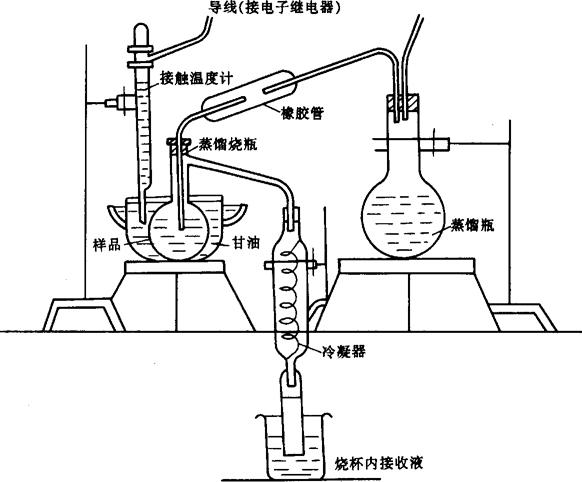 图2-2 水蒸气蒸馏装置 3.1.1 蒸汽发生瓶:1L圆底烧瓶。 3.1.2 蒸馏烧瓶:500mL平底烧瓶。 3.1.3 冷凝管及接收瓶:14#磨口、300mm长的蛇形冷凝器,上口与蒸馏弯头连接,下口与带14#磨口的筒形管连接,管端插入300mL带盖烧杯中,作馏出液接收瓶用,为便于控制馏出液量,在烧杯150mL液面处划一标线。 3.1.4 接触温度计:200℃。 3.1.5 玻璃基板:8cm×15cm。 3.1.6 微量注射器:10μL、50μL、100μL。 3.1.7 层析缸:10cm×9cm×17cm。 3.1.8 涂敷器。 3.1.9 电吹风。 3.1.10 玻璃喷雾器。 3.1.11 粉粒收集管。 3.1.12 分光光度计。 3.1.13 玻璃棉:预先用约2mol/LNaOH溶液浸泡,再用水浸漂洗干净;用2mol/LHCl溶液浸泡,再用自来水漂洗干净;最后用蒸馏水漂洗至中性,烘干备用。 4.操作步骤 4.1 样品制备和提纯 取样品约30g,放于玻璃研钵中充分研细,混匀后,准确称取20g放于蒸馏烧瓶中,加16g无水氯化钙,200mL蒸馏水。开启电源,加热甘油浴,调节温度为140℃,同时将蒸汽发生瓶加热,使瓶内蒸馏水沸腾发生水蒸气,立即装上蒸馏弯头、导汽管等,并开启冷凝水,保持蒸馏烧瓶中的样品缓缓沸腾,蒸馏45min,至馏出液达150mL标记处时,关闭电源及冷却水,立即取出接收瓶。 将馏出液转移到250mL分液漏斗中,振摇数下,倒置分液漏斗,打开活塞放气后,再振摇30s,静置分层后,将下层水液放入另一分液漏斗中,收集上层石油醚,再加20mL石油醚到水层中,振摇约30s,静置分层,将下层水液放入原分液漏斗中。石油醚层合并到第一次石油醚液中去,再加20mL石油醚到分液漏斗的水层中,振摇30s,静置分层,放去下层水液。将3次石油醚抽提液混合在一起,流经20g无水硫酸钠的小漏斗过滤,脱水,并用少量石油醚洗漏斗,滤液一起倒入K、D浓缩器中减压浓缩(温度不超过40℃)至0.5~0.7mL,留待薄层层析用。 4.2 薄层层析定性 用微量注射器吸取样液30μL(根据样液中所含BHA、BHT浓度而增减)点在薄板上,点样线距底边2cm,标准溶液与样品同时点在一块板上。 将薄板放入层析缸(先用相应的溶剂系统饱和),薄板下端浸入溶剂0.5~1cm,密闭层析缸,在暗室中避光保存,待溶剂前沿升达14cm处时,取出薄板置于通风柜中,自然暗干后,喷洒不同显色剂,根据其比移值(Rf)及标准BHA、BHT出现相同的色斑来定性确证。