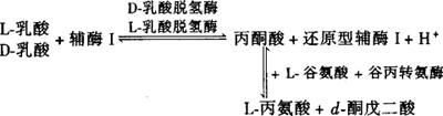 式中 ρ——样液中乳酸浓度,mg/mL m——取样量,g 乳酸钙质量分数(%)=乳酸质量分数(%)×1.711 乳酸铁质量分数(%)=乳酸质量分数(%)×1.599 乳酸钠质量分数(%)=乳酸质量分数(%)×1.244 (二)比色法 1.原理 乳酸在乳酸脱氢酶的作用下,进行如下反应: