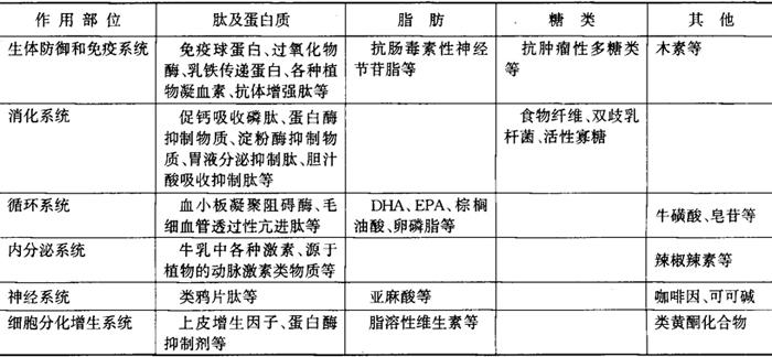 | 释义 | 食品中的生理功能性物质 源于食品的已知生理功能性因素参见表2-7-2,属于肽、蛋白质、脂肪、糖等的特殊成分与人体防御、免疫、消化、循环、内分泌、神经及细胞分化、生殖等系统有关。 表2-7-2 食品中的生理功能性因子
