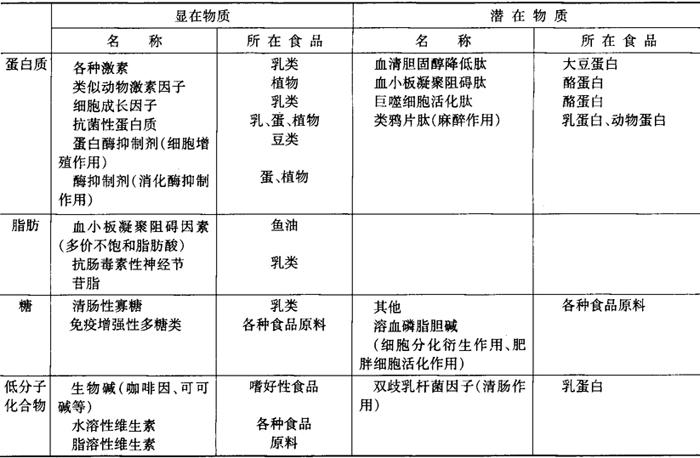 表2-7-3为食品中显在和潜在的功能性生理活性物质。显在物质中,蛋白质有关物质多为激素、细胞增殖与生长因子、抗菌性蛋白质、酶等。脂肪有关物质为含于鱼油中的血小板凝聚阻害因子二十碳五烯酸(EPA)。糖类物质有乳中的清肠性寡糖和免疫性多糖。低分子物质有生物碱和维生素类。潜在的物质由于在消化过程中被切断,具有显在化活性功能,因此发现较晚,多含于蛋白质衍生的肽类中。 表2-7-3 食品中的生理功能性物质