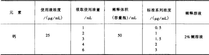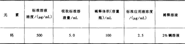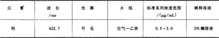 式中 V——滴定所消耗乙二胺四乙酸二钠标准溶液的体积,mL c——乙二胺四乙酸二钠标准溶液的浓度,mol/L m——试样质量,g 0.05——每毫摩 5.允许差 平行测定两结果之差不大于0.20%。 十、食品中钙的测定方法 (一)原子吸收分光光度法 1.原理 样品经湿消化后,导入原子吸收分光光度计中,经火焰原子化后,吸收波长422.7nm的共振线,其吸收量与含量成正比,与标准系列比较定量。 2.试剂和溶液 要求使用去离子水,优级纯试剂。 2.1 盐酸。 2.2 硝酸。 2.3 高氯酸。 2.4 混合酸消化液 硝酸与高氯酸比为4∶1。 2.5 0.5mol/L HNO3溶液 量取45mL硝酸,加去离子水并稀释至1000mL。 2.6 2%氧化镧溶液 称取25g氧化镧(纯度大于99.99%),加75mL盐酸于1000mL容量瓶中,加去离子水稀释至刻度。 2.7 钙标准溶液 精确称取1.2486g碳酸钙(纯度大于99.99%),加50mL去离子水,加盐酸溶解,移入1000mL容量瓶中,加2%氧化镧稀释至刻度。贮存于聚乙烯瓶内,4℃保存。此溶液每毫升相当于500μg钙。 2.8 钙标准使用液 钙标准使用液的配制见表9-4。钙标准使用液配制后,贮于聚乙烯瓶内,4℃保存。 表9-4 钙标准使用液配制