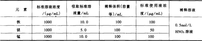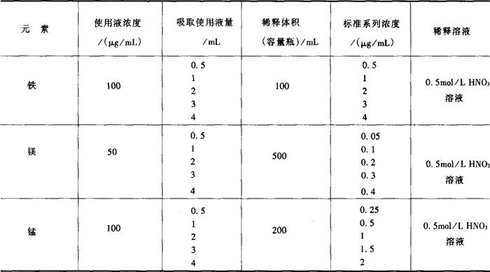 标准使用液配制后,贮存于聚乙烯瓶内,4℃保存。 3.仪器 所用玻璃仪器均以硫酸-重铬酸钾洗液浸泡数小时,再以洗衣粉充分洗刷,后用水反复冲洗,最后用去离子水冲洗晒干或烘干,方可使用。 3.1 实验室常用设备。 3.2 原子吸收分光光度计。 4.测定方法 4.1 样品处理。 4.1.1 样品制备:微量元素分析的样品制备过程中应特别注意防止各种污染。所用设备如电磨、绞肉机、匀浆器、打碎机等必须是不锈钢制品。所用容器必须使用玻璃或聚乙烯制品。 湿样(如蔬菜、水果、鲜鱼、鲜肉等)用水冲洗干净后,要用去离子水充分洗净。干粉类样品(如面粉、奶粉等)取样后立即装容器密封保存,防止空气中的灰尘和水分污染。 4.1.2 样品消化:精确称取均匀样品干样0.5~1.5g(湿样2.0~4.0g,饮料等液体样品5.0~10.0g)于250mL高型烧杯中,加混合酸消化液20~30mL,上盖表皿。置于电热板或电沙浴上加热消化。如未消化好而酸液过少时,再补加几毫升混合酸消化液,继续加热消化,直至无色透明为止。加几毫升去离子水,加热以除去多余的硝酸。待烧杯中的液体接近2~3mL时,取下冷却。用去离子水洗并转移于10mL刻度试管中,加去离子水定容至刻度。 取与消化样品相同量的混合酸消化液,按上述操作做空白试验测定。 4.2 测定 将铁标准使用液配制不同浓度系列的标准稀释液方法如表9-2所示,测定操作参数如表9-3所示。 表9-2 不同浓度系列标准稀释液的配制方法