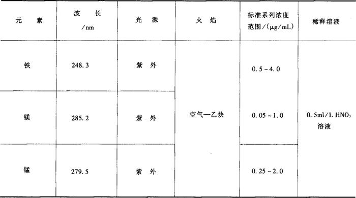 式中各符号的含义同曲线法说明。 4.4结果的重复性 同实验室平行测定或连续两次测定结果的重现性小 最低检测限:0.2μg/mL。 (二)硫氰酸钾法 1.原理 样品经灰化处理后,铁的氧化物用盐酸溶解,三价铁与硫氰酸钾生成红色的硫氰酸盐。其呈色深浅与含铁的浓度成正比。利用此红色进行比色测定。 2.试剂和溶液 2.1 20%硫氰酸钾 称取20g硫氰酸钾(分析纯),溶于100mL蒸馏水。 2.2 2%过二硫酸钾(K2S2O7) 称取2g过二硫酸钾溶解于100mL蒸馏水。 2.3 铁标准溶液 精确称取0.0498g硫酸亚铁(FeSO4·7H2O)溶于100mL蒸馏水中,加上5mL浓硫酸,微加热。随即滴加2%高锰酸钾至最后一滴颜色不变为止。然后,以蒸馏水稀释到1000mL,此溶液每毫升相当于含铁10μg。 3.仪器 分光光度计。 4.测定方法 4.1 样品处理 精确称取1~2g样品,移入干净的瓷坩埚中,在电炉上微火炭化,再移入灰化炉中,慢慢升温到500℃灰化至白色灰烬。如果有黑色炭粒,则加少量蒸馏水,将灰分溶解,在水浴上蒸干,再加0.5~1.0mL过氧化氢,亦须在水浴上蒸干,继续灰化至白色。将样品的灰分加入5mL1∶4盐酸,在水浴上蒸干。再加5mL于电热板加热溶解残渣,随即移入25mL容量瓶中,再用热蒸馏水洗涤坩埚3~4次,洗液移入容量瓶中,冷却稀至刻度,备用。 精确吸取铁标准溶液:0.0、0.2mL,0.4mL、0.6mL、0.8mL、1.0mL(相当于铁的含量0,2μg、4μg、6μg、8μg、10μg)置25mL比色管中,加0.5mL浓硫酸,以蒸馏水稀释,使最终体积为5mL(可先加蒸馏水后加硫酸),冷却后,依次加入0.2mL2%过硫酸钾、2mL20%硫氰酸钾,以蒸馏水稀释至10mL。用1cm比色皿,于波长485nm处在分光光度计上比色测定。以消光度为纵坐标,铁的含量为横坐标绘制标准曲线。 4.2 样品测定 精确吸取样品液1~5mL,置于25mL比色管中,其余操作步骤与上述标准曲线相同,同样作试剂空白。 其他实验条件:仪器狭缝、空气及乙炔的流量、灯头高度、元素灯电流等均按使用的仪器说明调至最佳状态。 将消化好的样液、试剂空白液和元素的标准浓度系列分别导入火焰进行测定。 4.3 标准曲线法 以各浓度系列标准溶液与对应的吸光度绘制标准曲线。铁、镁、锰的标准曲线如图9-1、图9-2和图9-3所示。它们的线性相关系数分别为0.9996,0.9998,0.9991。