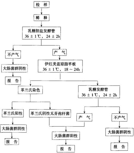 | 释义 | 食品卫生微生物学检验 大肠菌群测定(摘自GB4789.3) (一)主题内容与适用范围 本标准规定了食品中大肠菌群的测定方法。 本标准适用于食品中大肠菌群的测定。 (二)术语 大肠菌群系指一群能发酵乳糖、产酸、产气、需氧和兼性厌氧的革兰氏阴性无芽孢杆菌。该菌主要来源于人畜粪便,故以此作为粪便污染指标来评价食品的卫生质量,推断食品中有否污染肠道致病菌的可能。 食品中大肠菌群数系以100mL(g)检样内大肠菌群最可能数(MPN)表示。 (三)引用标准 GB4789.28 食品卫生微生物学检验 染色法、培养基和试剂 (四)设备和材料 (1)温箱 36±1℃。 (2)冰箱 0~4℃。 (3)恒温水浴 44.5±0.5℃。 (4)天平。 (5)显微镜。 (6)均质器或乳钵。 (7)平皿 直径为90mm。 (8)试管。 (9)吸管。 (10)广口瓶或三角烧瓶 容量为500mL。 (11)玻璃珠 直径约5mm。 (12)载玻片。 (13)酒精灯。 (14)试管架。 (五)培养基和试剂 (1)乳糖胆盐发酵管 按GB4789.28中4.9规定。 (2)伊红美蓝琼脂平板 按GB4789.28中4.25规定。 (3)乳糖发酵管 按GB4789.28中4.10规定。 (4)EC肉汤 按GB4789.28中4.11规定。 (5)磷酸盐缓冲稀释液 按GB4789.28中3.22规定。 (6)生理盐水。 (7)革兰氏染色液 按GB4789.28中2.2规定。 (六)检验程序 大肠菌群检验程序如下: