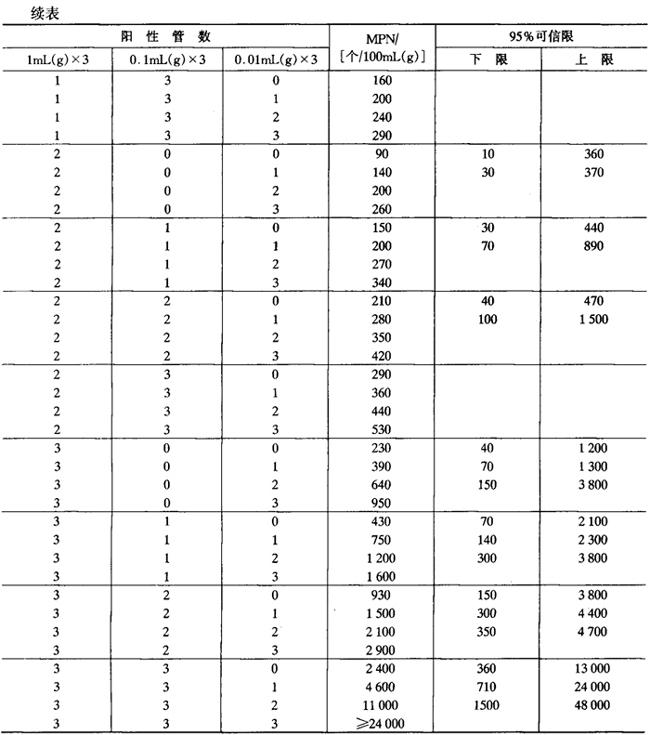 注:①本表采用3个稀释度[1mL(g)、0.1mL(g)和0.01mL(g)],每稀释度3管。 ②表内所列检样量如改用10mL(g)、1mL(g)和0.1mL(g)时,表内数字应相应降低10倍;如改用0.1mL(g)、0.01mL(g)和0.001mL(g)时,则表内数字应相应增加10倍。其余可类推。 (八)粪大肠菌群(faecal coliform) 1.鉴定 用接种环将所有产气的乳糖胆盐发酵管培养物转种于EC肉汤管内,置44.5±0.2℃水浴箱内(水浴箱内的水面应高于EC肉汤液面)培养24±2h,经培养后,如所有EC肉汤管均不产气,则可报告为阴性;如有产气者,则将所有产气的EC肉汤管分别转种于伊红美蓝琼脂平板上,置36±1℃培养18~24h,凡平板上有典型菌落者,则证实为粪大肠菌群阳性。 2.结果报告 根据证实为粪大肠菌群阳性的管数,查表5-3-3MPN检索表,报告每100mL(g)粪大肠菌群的MPN值。 |