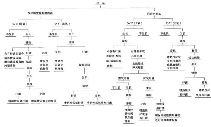 | 释义 | 食品卫生微生物学检验 罐头食品商业无菌的检验(摘自GB4789.26) (一)主题内容与适用范围 本标准规定了罐头食品商业无菌检验的基本要求、操作程序和结果判定。 本标准适用于各种密封容器包装的,经过适度的热杀菌后达到商业无菌,在常温下能较长时间保存的罐头食品。 (二)术语 1.罐头食品的商业无菌(commercial sterilization of canned food) 罐头食品经过适度的热杀菌以后,不含有致病的微生物,也不含有在通常温度下能在其中繁殖的非致病性微生物,这种状态称作商业无菌。 2.密封(hermetical seal) 密封是指食品容器经密闭后能阻止微生物进入的状态。 3.胖听(swell) 胖听是指由于罐头内微生物活动或化学作用产生气体,形成正压,使一端或两端外凸的现象。 4.泄漏(leakage) 泄漏是指罐头密封结构有缺陷,或由于撞击而破坏密封,或罐壁腐蚀而穿孔致使微生物侵入的现象。 5.低酸性罐头食品(low acid canned food) 低酸性罐头食品是指除酒精饮料以外,凡杀菌后平衡pH大于4.6、水分活性值大于0.85的罐头食品。原来是低酸性的水果、蔬菜或蔬菜制品,为加热杀菌的需要而加酸降低pH的,属于酸化的低酸性罐头食品。 6.酸性罐头食品(acid canned food) 酸性罐头食品是指杀菌后平衡pH等于或小于4.6的罐头食品。pH小于4.7的番茄、梨和菠萝以及由其制成的汁,以及pH小于4.9的无花果都算作酸性食品。 (三)设备和仪器 (1)超净工作台。 (2)冰箱 4℃。 (3)恒温箱 30±1℃、36±1℃、55±1℃。 (4)显微镜 带油镜头。 (5)电子秤或台天平。 (6)接种环。 (7)卫生开罐刀和罐头打孔器。 (8)白色搪瓷盘。 (9)电位pH计。 (10)灭菌试管、吸管、平皿。 (11)酒精灯。 (12)灭菌镊子。 (四)培养基和试剂 (1)革兰氏染色液。 (2)疱肉培养基。 (3)溴甲酚紫葡萄糖肉汤:见附录AA1。 (4)酸性肉汤 见附录AA2。 (5)麦芽浸膏汤 见附录AA3。 (6)锰盐营养琼脂 见附录AA4。 (7)血琼脂。 (8)卵黄琼脂。 (9)75%酒精溶液。 (五)检验步骤 1.审查生产操作记录 工厂检验部门对送检产品的下述操作记录应认真进行审阅。妥善保存至少三年备查。 (1)杀菌记录 杀菌记录包括自动记录仪的记录纸和相应的手记记录。记录纸上要标明产品品名、规格、生产日期和杀菌锅号。每一项图表记录都必须由杀菌锅操作者亲自记录和签字,由车间专人审核签字,最后由工厂检验部门审定后签字。 (2)杀菌后的冷却水有效氯含量测定的记录。 (3)罐头密封性检验记录 罐头密封性检验的全部记录应包括空罐和实罐卷边封口质量和焊缝质量的常规检查记录,记录上应明确标记批号的罐数等,并由检验人员和主管人员签字。 2.抽样方法 可采用下述方法之一。 (1)按杀菌锅抽样 低酸性食品罐头在杀菌冷却完毕后每杀菌锅抽样2罐,3kg以上的大罐每锅抽1罐,酸性食品罐头每锅抽1罐,一般一个班的产品组成一个检验批,将各锅的样罐组成一个样批送检,每批每个品种取样基数不得少于3罐。产品如按锅划分堆放,在遇到由于杀菌操作不当引起问题时,也可以按锅处理。 (2)按生产班(批)次抽样 ①取样数为1/6000,尾数超过2000者增取1罐,每班(批)每个品种不得少于3罐。 ②某些产品班产量较大,则以30000罐为基数,其取样数按1/6000计,超过30000罐以上的按1/20000计,尾数超过4000罐者增取1罐。 ③个别产品产量过小,同品种、同规格可合并班次为一批取样,但并班总数不超过5000罐,每个批次取样数不得少于3罐。 3.称重 用电子秤或台天平称重,1kg及以下的罐头精确到1g,1kg以上的罐头精确到2g。各罐头的质量减去空罐的平均质量即为该罐头的净重。称重前对样品进行记录编号。 4.保温 (1)将全部样罐按下述分类在规定温度下按规定时间进行保温,见表5-3-4。 表5-3-4