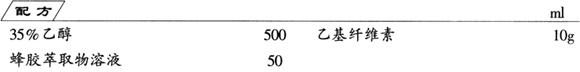 (1)蜂胶萃取物溶液制备 取蜂巢巢壁附着物2份(质量),捣碎后,加入7份(质量)35%的乙醇中,搅拌混合后密封,每日摇动数次,于室温贮放10d以上,然后过滤,滤液贮存备用。滤渣再用35%乙醇按同样比例混合,于同样条件下浸置3d后,过滤,滤渣弃去,滤液同上次滤液合并,即得蜂胶萃取物溶液。