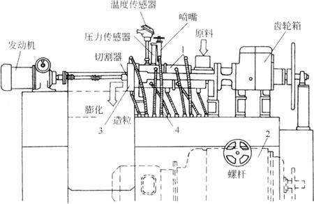 1-挤压系统 2-传动系统 3-模头系统 4-加热(冷却)系统