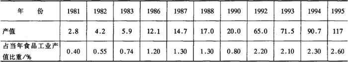 | 释义 | 食品机械工业的概况和发展趋势 1 食品机械工业的概况 1.1 食品机械工业体系逐步形成 我国食品机械的发展起步于70年代,到80年代末和90年代初实现了高速发展,形成了一批具有一定技术水平、装备条件、自主开发能力和一定规模经济的骨干企业和以部属科研院所为龙头,地方科研所为骨干,企业科技力量为基础的科技队伍和科技开发能力,以及相当数量的设有食品工程专业的大专院校培养了大批专业技术人员,初步形成了独立的工业体系。 据不完全统计,到1995年底全国约有食品机械制造厂家1800家,科研单位近百家,科技人员4000余人,职工近30万,与1986年相比分别增加138%、90%、300%和120%。 1.2 食品机械产品品种和产值稳步上升 食品机械产品品种由1986年的1000种增加到1500种。食品机械的总产值由1986年的12.1亿增加到1995年的117亿元。食品机械工业产值占食品工业总产值的比重由80年代的0.9%增长到1995年的2.6%。 表1-1-2 中国历年食品机械工业总产值 单位:亿元人民币