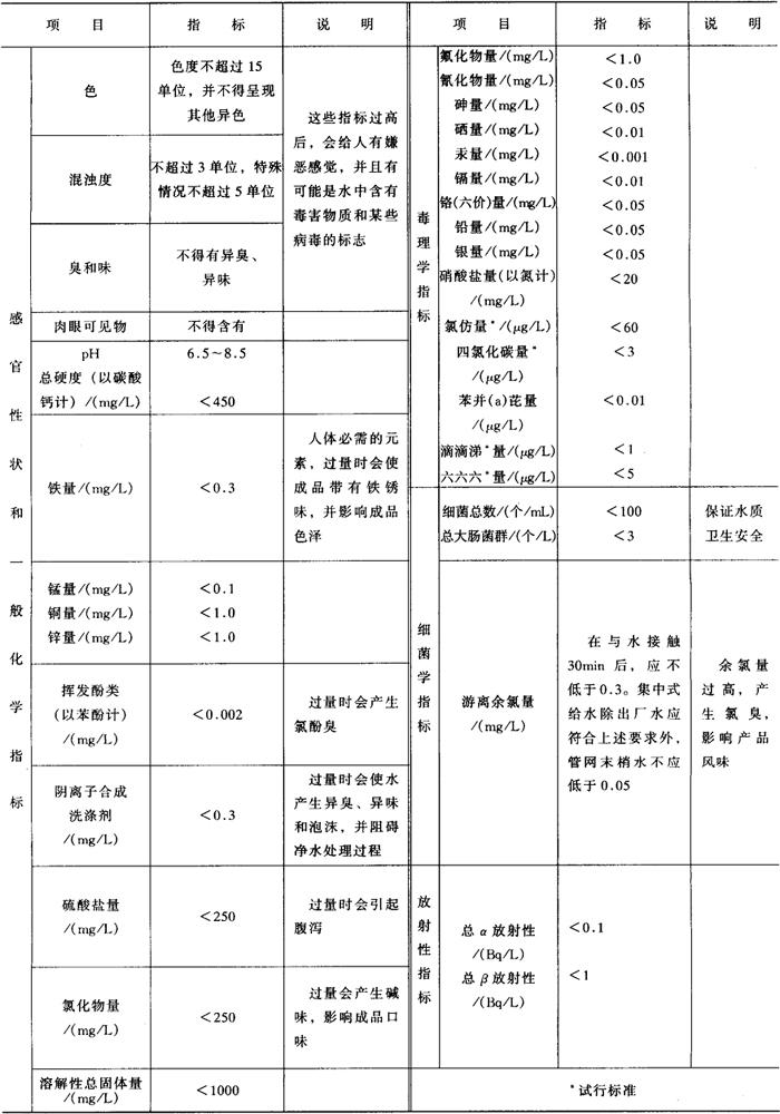| 释义 | 食品生产用水卫生要求 (一)食品生产用水的分类 水是食品生产中的重要原料,但并非所有的水都可以供食品企业使用,水质的好坏将直接影响产品的质量和卫生。食品生产用水可按水的来源、水质和水的用途分类: 1.按水源分类 食品生产用水按水源可分为地面水和地下水。 (1)地面水是指地面水包括河水、江水、湖水和水库水等。由于地面水是在地面流过,溶解的矿物质较少,水质软。这类水的硬度为0.5~4.0mmol/L。地面水易被污染。有的河水实际上有地下水,故除含泥沙、有机物外,还有多种可溶性盐类。 (2)地下水是指地下水可分为浅层地下水、深层地下水和泉水三种。浅层地下水水质物理性状较好,水质澄清,但经常溶解土壤中某些矿物盐类,而使水质变硬;深层地下水水层较浅层地下水水质为好,但如果水层中存在某些盐类时,也能使水质变硬或铁、氟含量过高,不适于饮用。地下水硬度为1.0~5.0mmol/L,有的高达5.0~12.5mmol/L。 2.按水质分类 (1)软水是指矿物质溶解较少的水,如雨水、蒸馏水等都是软水。 (2)硬水是指矿物质溶解较多的水,尤其是含钙盐、镁盐等盐类物质较多。 根据水中所含矿物质的数量及成分的不同,硬水又可分为暂时硬水和永久硬水。 ①暂时硬水:水中的钙盐和镁盐经加热煮沸可析出沉淀物和分解成二氧化碳而变软。 ②永久硬水:水中的钙盐和镁盐经加热煮沸后仍不能除去。 (3)碱性水是指水的pH大于7的水。 (4)酸性水是指水的pH小于7的水。 (5)咸水是指含有较多氯化钠的水。 水的硬度是指水中溶解的钙、镁等盐类的总含量。我国常以硬度的度数来表示水的软硬程度,1°d是指1L水中含有10mg氧化钙。水质硬度的法定计量单位是m mol/L,1°d等于0.35663mmol/L。按硬度高低可将水划分为6种: ①极软水,0~4°d;②软水,4~8°d;③中硬水,8~12°d;④软硬水,12~18°d;⑤硬水,18~30°d;⑥极硬水,30°d以上。 3.按用途分类 (1)生产原料用水是指如面包、方便面等调制面团用水。 (2)非工艺用水包括水蒸气用水、清洗用水、制冷用水等。 (二)食品用水的卫生要求 不论是食品生产的原料用水,还是食品生产经营过程中的非工艺用水,都必须符合我国GB 5749-1985《生活饮用水卫生标准》。 我国生活饮用水卫生标准见表1-2-26。 表1-2-26 生活饮用水卫生标准(GB 5749-1985)