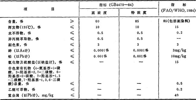 性能 红棕色至暗红棕色粉末或颗粒,无臭。易溶于水(17.2g/100mL,21℃)(水溶液带紫色),溶于30%酒精、甘油和稀糖浆中,微溶于纯酒精(0.5g/100mL50%乙醇)和溶纤素,不溶于其它有机溶剂。对柠檬酸及酒石酸稳定。遇浓硫酸呈紫色,稀释后呈桃红色,遇浓盐酸呈棕色溶液,有黑色沉淀。水溶液遇浓盐酸呈品红色;遇氢氧化钠呈红棕色。遇铜、铁易退色。耐光、耐热性强(105℃),耐氧化、还原性差,适用于发酵食品及含还原性物质的食品。染色力较弱。结构属偶氮型酸性染料。毒性:ADI0~0.5mg/kg(FAO/WHO,1985)。LD50>10g/kg(小鼠,经口)。 质量规格(GB4479-84;FAO/WHO,1984)