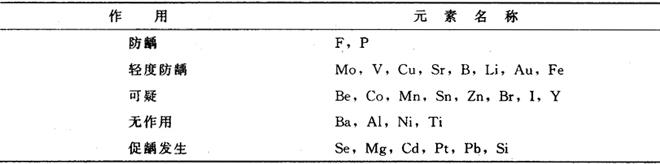 从表中可以看出,食物中碳水化合物,以蔗糖的致龋力最大。 为防止龋病,国内外学者试图以其他甜味剂代替蔗糖,现将常用的几种介绍如下。 1.山梨醇 许多水果如李子、生梨、苹果、草莓等都含有一定量的山梨醇。每克山梨醇可产生16.7J热量,口服后70%被吸收,但用量过多可能会造成胃肠功能紊乱。世界卫生组织(WHO)及联合国粮农组织(FAO)推荐山梨醇每日用量不得超过150mg/kg。 山梨醇与蔗糖比较,龋病发生率显着下降,菌斑聚集明显减少。如果将6%~20%的山梨醇加入牙膏内可作为甜味剂。 2.木糖醇 各种水果、蔬菜、果实中都含有木糖醇,其甜度与蔗糖相似,还有爽口感。 动物实验防龋效果优于山梨醇,但可使动物生长受限,体质变弱。人体实验菌斑指数较食用蔗糖减少。 3.环己烷胺磺酸钠 甜度是蔗糖的30倍,味道好,易溶于水,经动物实验证实无毒性。但慢性毒性试验生长率下降,对骨髓细胞线粒体有破坏作用,能否长期使用,仍有待进一步研究。 【蛋白质】 蛋白质与龋病的易感性关系尚未下定论。但动物实验已证明,严重的营养缺乏可影响牙齿的生长发育和唾液分泌,从而增加龋病的易感性。Haw(1970)与Navia(1979)研究表明,大鼠在妊娠期和哺乳期蛋白质缺乏可导致牙齿变小,萌牙期推迟,易发生龋齿。由此可推论,在牙齿生长发育期,蛋白质营养缺乏可增高龋病的易感性。故建议在妊娠期的妇女和哺乳期的婴幼儿应适量补充蛋白质。 【脂肪】 Williams(1982)的动物实验表明:牙齿萌出后增加食物中脂肪的含量可降低患龋率。这可能是由于在牙釉质表面形成了一层脂肪膜防止牙釉质脱矿或隔绝了碳水化合物与细菌的接触。另有学者报道,脂肪含量高的食物可使口腔菌丛明显减少。Chmeck(1980)报道,动物在吃糖后立即饲以一种乳酪可减少患龋率。 【维生素】 维生素A严重缺乏时可引起釉质发育不全、釉质器萎缩、造釉细胞变形,并对造牙本质细胞和牙本质都有一定影响。 维生素B族是口腔细菌的营养物质,特别是对那些产酸的致龋细菌更为重要。食物中维生素B族缺乏可能会减少龋病发生。 维生素D与钙、磷代谢有关,有学者认为维生素D可促进牙齿中钙、磷的沉积,对预防龋病可能有一定的作用。 【矿物质】 食物中的矿物质,特别是钙、磷、氟对牙齿的矿化很重要。 1.钙与磷 钙与磷是牙齿的主要组成部分。牙齿的生长发育受钙与磷代谢的影响。在动物实验中钙含量高、磷含量低的食谱,对龋病易感性增加,可造成龋损。正常食谱中增加适量的磷可降低患龋率65%,如含磷超过0.8%并不能明显增加其防龋效果。 2.铁 从动物实验中发现,食谱中如缺乏铁,不仅造成贫血还容易产生牙病。含56%的蔗糖的致龋食谱如果再增加铁的含量其患龋率可降低50%。最近有专家用蔗糖含量低的食物和边缘性缺铁的实验,证明缺铁对龋病易感性有一定重要作用。 3.其他微量元素 除氟之外其他微量元素在防龋方面的作用,表41-3可供参考。 表41-3 微量元素与龋病的关系