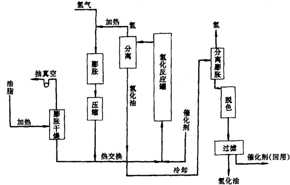 图1-3-43 间歇式氢化工艺流程 工作过程:首先氢化罐泵入占容量60%~70%的油,然后抽真空除去空气,并加热脱水,直到温度上升到135℃左右,停止抽真空,开始按预定压力送入氢气,进行氢化反应。期间要不断补充氢气,直至完成氢化再放出氢气。将油抽入冷却罐进行冷却。冷却到71~88℃送去过滤,回收催化剂。氢化反应时间按氢化油的饱和程度而定。产品饱和程度高即碘价要求低,所需升温的时间就长。氢化反应的一般条件是:氢气压力从常压至0.8MPa,反应温度120~170℃,催化剂用量0.05%~0.15%(镍含量)。当反应完成后,须按规定碘价进行测定,也可以按碘价的变化来确定用氢量。实际氢耗量是理论量的1~3倍。也可以按碘价每下降1单位每吨油耗氢气1~2m3计算。 连续式氢化工艺流程见图1-3-44。工作过程:油脂原料经过加温预热,进入真空条件下的膨胀干燥器,干燥后被抽出,用活塞泵压送,使其升到2.5MPa,然后与氢气进入加热器和热交换器,最后进入压力为2.5MPa的氢化反应罐。与此同时,预备好的催化剂按比例也进入氢化反应罐。氢化后进入分离器,分离出剩余的氢经加热重复使用。氢化物经热交换器进入冷却器冷却,通过分离膨胀后,最后经过脱色及过滤,分离出氢化油及催化剂。 食用氢化油的标准要求是:熔点38~42℃,水分小于0.3%,杂物小于0.2%,含镍量十万分之二。