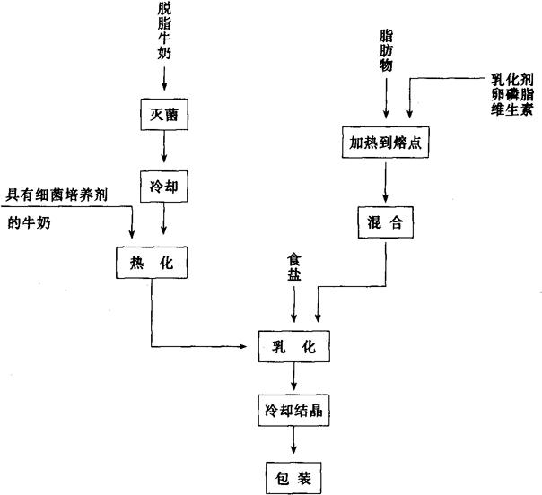 图1-3-44 连续式氢化工艺流程 2.2 人造奶油加工工艺 人造奶油是将脂肪相、液体相(水-牛奶等)以及少量添加剂经过均质和乳化形成的油脂制品。人造奶油在组织结构、口感和营养等方面与奶油接近。 动物油和植物油均可作人造奶油的原料。由于动物油含胆固醇较高,目前多以氢化植物油或植物油为主要原料。在有些人造奶油中,还加入经乳酸发酵的牛奶或奶粉,使其具有奶油的香气和味道,还可以防止氧化,防止维生素A降低效用。制作人造奶油可以有不同的配方,因此对原料和添加剂要求也不同。 人造奶油加工工艺流程见图1-3-45。脱脂牛奶经过灭菌冷却、乳酸发酵成熟进入乳化器乳化,混合油脂物、维生素、卵磷脂及乳化剂被加热到高于油脂熔点4~5℃,混合后进入乳化器,乳化后经过冷却结晶,包装后即为人造奶油。