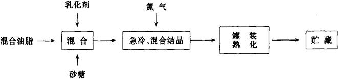 图1-3-45 人造奶油加工工艺流程 2.3 起酥油加工工艺 起酥油范围相当广泛,目前尚无明确定义。一般可理解为:动、植物油经精制加工或硬化、混合、速冷、捏合等处理,使之具有可塑性、乳化性等加工性能的油脂。它一般不直接消费,而是作为加工食品的原料。起酥油分类方法很多,按原料种类可分为植物型、动物型、动植物混合型起酥油。按制造方式可分为混合型和全氧化型起酥油。全氧化型起酥油一般用单一的植物油(棉籽油、大豆油)氧化而成。与混合法制得的相同稠度的油相比稳定性好。如果把两种以上的全氢化油混合,可得到不但稳定性好,而且可塑性范围大的起酥油。全氧化起酥油适用于饼干、油炸食品等,它能使食品具有酥脆易碎的特性。 起酥油主要是由动、植物油脂或氧化油与植物油脂按一定比例混合,再根据不同要求加入乳化剂、单甘酯、卵磷脂、砂糖等添加物制造而成,其工艺流程见图1-3-46。根据要求选定的不同油脂进行混合后作为主要原料,添加各种乳化剂进行混合搅拌。由于油脂本身是一种混合物,有的熔点高,有的很低,如让其慢慢冷却则会使不同熔点油脂分离,所以需经急速冷却处理,即一边急速冷却,一边搅拌,使高、低不同熔点的油脂混合均匀,形成小的油脂结晶颗粒,因而具有较大的可塑性的范围。经过急速冷却的油脂,一般还向油脂内打入氮气,气泡均匀分布在油脂内,使产品在颜色上更洁白,同时在搅拌时易于打发。经急速冷却混合搅拌熬制后将油脂装箱,贮存于27~30℃,室内48~72h,重新调整油脂的结晶形态,增加油脂的融合力量提高其稳定性也即熟化。
