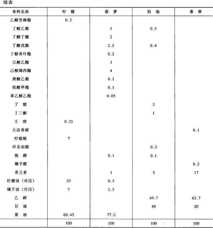 | 释义 | 食用香精 在食品加香中,目前生产上除橘子油、香兰素等少数和品种外,香料一般不单独使用,通常是用数种乃至数十种香料调和起来,才能适合应用上的需要。这种经配制而成的香料称为香精。 香精的基本组成是:主香剂、顶香剂、辅助剂、定香剂。主香剂是构成香精香气类型的基本香料,决定香精所属品种。顶香剂是易挥发的或强烈的天然香料和人造香料,使得代表香气类型的成分更明显突出。辅助剂可分为协调型和变调型两种,协调型辅助剂是衬托主香剂,使香气明显突出;变调型辅助剂则是使香气别致。定香剂是使各种香料挥发均匀,使香精保持均匀而持久的芳香。有时为了使用方便,还在香精中加入适量的稀释剂,如乙醇、甘油、丙二醇等。 香精按其性能可分为水溶性香精和油溶性香精两大类,除此之外还有乳化香精、粉末香精、果香基香精、肉味香精等。 (一)食用水溶性香精 水溶性香精系用蒸馏水、乙醇、丙二醇或甘油为稀释剂调和以香料而成的。 食用水溶性香精应是透明的液体,其色泽、香气、香味与澄清度符合各该型号的标样,不呈现液面分层或浑浊现象。本品在蒸馏水中的溶解度一般为0.1%~0.15%(15℃),对20%乙醇的溶解度为0.2%~0.3%(15℃)。食用水溶性香精易挥发,不适合在高温操作下的食品赋香之用。 水溶性香精是将香基与蒸馏水、乙醇、丙二醇、甘油等水溶性稀释剂,按一定比例和适当的顺序互相混溶、搅拌、过滤、着色而成。调好的香精有的要放置一段时间,叫成熟期,以使其香味更为圆熟。 在调配水溶性香精时,若使用精油类香料,应先适度地除去其中萜类,以改善其水溶性。去萜的方法之一是先将精油、蒸馏水和乙醇在容器中充分搅拌,低温静置,因萜类在乙醇溶液中的溶解度低,所以大部分上浮,而含香的水溶性物质则溶于乙醇溶液中,趁冷加入适当的助滤剂将析出物滤去,这样可将上下层分开,下层放入调和容器中,用于配制香精。 (二)食用油溶性香精 油溶性香精系用精炼植物油、甘油或丙二醇等作稀释剂调和以香料而成的。 食用油溶性香精一般应是透明的油状液体,其色泽、香气、香味与澄清度符合各该型号的标样,不呈现液面分层或浑浊现象。但以精炼植物油作稀释剂的食用油溶性香精在低温时会呈现冻凝现象。食用油溶性香精中含有较多量的植物油或甘油等高沸点稀释剂,其耐热性比水溶性香精高。 这里仅列举几个配方,以供了解香精的组成,见表1-3-11。 表1-3-11 几种食用油溶性香精配方