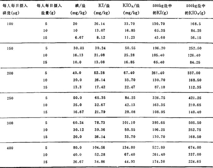表5-3-4表示了在摄入不同剂量碘时,相应的盐摄入量及所需碘化钾或碘酸钾剂量的相互关系。 表5-3-4 碘的摄入量、盐的摄入量及食盐中KI,KIO3含量