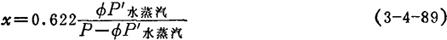 在该方程中因Φ为已知的常数,例如当Φ=1时,假定一个温度t,查饱和水蒸汽表可得到P′水蒸汽,按上式求出x,由t值和x值可在I-x图上确定一点,该点在Φ=1的相对温度线上,在I-x图上把由不同的t值和x值(当Φ=1时)所确定的点联结起来,则得到Φ=1的相对湿度曲线。其他等Φ线依此类推。 Φ=1的曲线表示在某一定温度下空气完全被水蒸汽所饱和。在此饱和线以上,为不饱和的湿空气区域,在此饱和线以下则为水蒸汽部分地自空气中冷凝析出的区域。 (5)水蒸汽分压线 水蒸汽分压值绘于I-x图之右纵坐标上,其单位为mmHg。水蒸汽分压与湿含量和总压强的关系式如下: