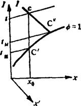 图3-4-84 I-x图用法之二 (3)已知空气的干球温度和湿含量,求其湿球温度及露点 干球温度为t的等温线和湿含量为x0的等x线的交点C即为空气的状态点。由C点沿等x线与Φ=1的等Φ线相交于C′点,过C′点的等温线所示的温度即为露点t露;过C点的等Ⅰ线与Φ=1的等Φ线交于C″点,过C″点的等温线所示的温度即为该空气的湿球温度tm见图3-4-85。