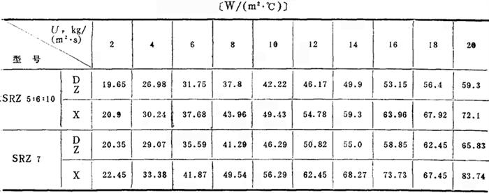 注:上述表格内、SRZ型号里的5∶6∶7∶10是表示SRZ型规格尺寸的净宽系列。 散热器计算: 已知条件:散热器传热量Q=223296W 蒸汽工作压力=0.4MPa(绝压) 计算: SRZ型散热器散热量按下式计算。 Q=KF(t′cP-tcP)(W) 式中 t′cP——热媒的平均温度,此处当P=0.4MPa时,t′cP=142℃ tcr——空气的平均温度,此处tcr= K——传热系数〔W/(m2·℃)〕 K值的选取:当空气流量为17000m3/h,温度30℃时,其相对密度为1.1kg/m2。则空气重量流量= Q——散热量,Q=223296(W)