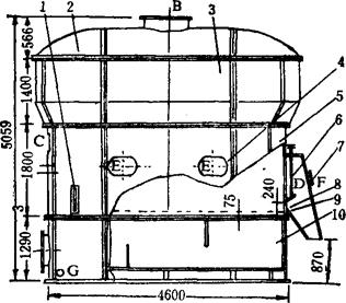 图3-4-89 沸腾干燥器结构图 1-视孔 2-顶盖 3-器体Ⅰ 4-人孔 5-器体Ⅱ 6-溢流堰板 7-视镜 8-卵石(15~30mm) 9-分布板 10-器体Ⅱ A进风口 B出风口 C进料口 D出料口 E人孔 F视镜 G排水口 H布料风口 |
