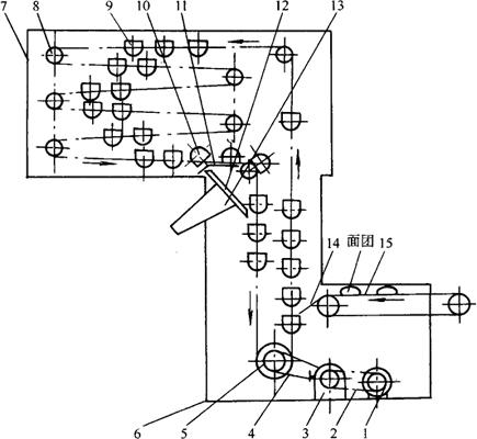图3-2-6 中间饧发机工作示意图 1-电动机 2-V带 3-减速器 4-链条 5-传动链轮 6-传动链条 7-箱体 8-张紧链轮 9-网斗 10-翻斗时网斗 11-翻斗机构 12-料槽板 13-出料斗 14-落料板 15-送入传送带 工作时,面团经送入传送带15,落料板被送入网斗9,网斗经链条带动在箱体内匀速运行,经过翻斗,面团从出料斗13送出进行成形操作。 中间饧发机的箱体一般采用金属支架,外壁用聚乙烯泡沫板保温。网斗一般用不锈钢丝冲压成碗形,表面喷涂聚四氟乙烯,可以防止面团粘连。一般采用6个网斗一排,用框架固定。 2.饧发室 饧发室一般采用砖墙结构。也有采用金属框架的拼装结构,用聚乙烯泡沫板保温。饧发室设有门,供放置饧发面块的饧发车进、出使用。饧发室顶应做成弧形,以利水珠能顺着屋顶及墙壁流到地面,避免水珠直接落到面团上,影响正常饧发。饧发室四周需设排水槽,让冷凝水及时排出防止室内积水。 供热、供湿一般采用锅炉供汽,也可采用室内电加热水箱加热、加湿的方式。 饧发室的结构简单,投资少,比较实用可靠,还可兼作发酵室使用。但劳动强度大,工艺操作条件差。 |