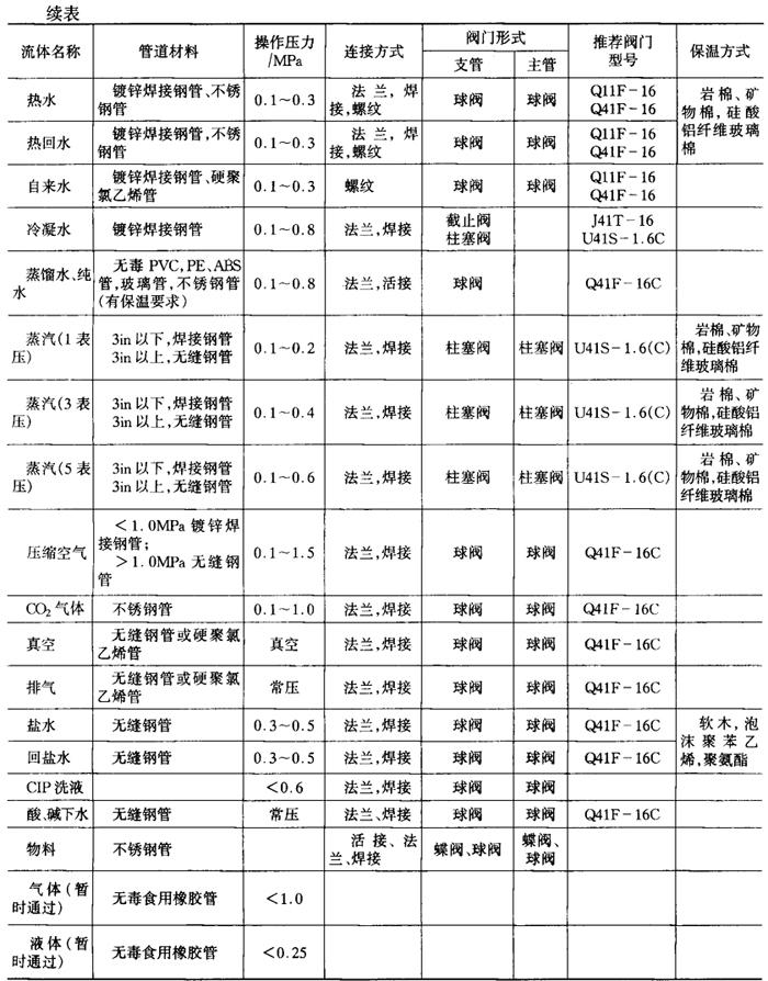 2.饮料厂常用管道材料及阀门形式 饮料厂常用管道材料及阀门形式见表6-4-34。 表6-4-34 饮料厂常用管道材料及阀门形式