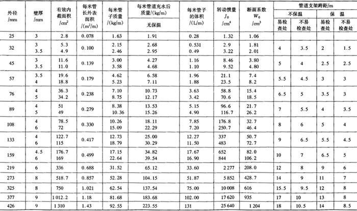 注:(1)“焊接钢管”系“低压流体输送用焊接钢管”(GB3092)的简称。 (2)截止阀将逐步由阀球阀取代。操作温度在100℃以下的蒸馏水、盐水(回盐水)及碱液尽量选用CQ11F16或Q41F-16,蒸汽柱塞尽量选用U41S-1.6(C)。 (3)连接方式中“活接”包括活接头连接及卡箍连接。 3.钢管的主要计算数值 钢管的主要计算数值见表6-4-35。 表6-4-35 钢管主要计算数值表