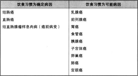| 释义 | 饮食 一个好的厨房就是一个好的药房,是抵御所有疾病的堡垒。 ——威廉·布雷(15世纪) 每天必须吃饭,这恐怕是我们人类最基本的特点了。因为良好的食欲和身体的需求,我们每隔几小时就会想起美味的食物。吃饭是“人生大事”,因此在建议饮食习惯时需要非常仔细和慎重。 在美国、英国和澳大利亚这些国家,三个癌症患者中就有一个可能通过改变饮食习惯来预防。 癌症的发生和饮食习惯密切相关,大肠癌(即结肠癌和直肠癌)及其癌前病变都和饮食因素有关,乳腺癌、前列腺癌、胃癌、食管癌、胰腺癌、子宫体癌、卵巢癌、肺癌、宫颈癌和饮食也有一定的关系(见表2-2)。 表2-2 与饮食相关的癌症
