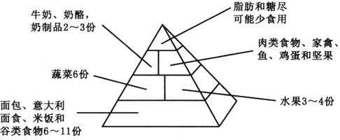 食物中的抗癌维生素和矿物质 本书后面的章节将会提到很多具有抗癌作用的含维生素和矿物质的食物,下面列出的只是其中的一部分。 β-胡萝卜素(维甲酸A) 胡萝卜、菠菜、椰菜、南瓜、杏、桃、香瓜和芒果 维生素C 橙子、柠檬及其他水果,胡椒粉、芹菜、卷心菜、菜花、椰菜和菠菜 维生素E 花生、杏、花生油、麦麸、甜土豆、菠菜和菜子油 叶酸 肝脏特别是鸡肝、麦麸、面包、菠菜、卷心菜、菜花、椰菜、莴笋、花生、花生油 硒 鱼、谷类食物、大蒜 钙 牛奶、脱脂奶、奶酪、低脂和脱脂型酸奶 选择癌症预防饮食的原则 改变饮食习惯非常不容易成功,但对于癌症预防却是最有效的。研究证明,只要尽早改变饮食习惯,就可以预防与饮食相关的各种疾病。 在热衷于烹调、品尝美味食品的同时也要了解食物中所含的营养物质,这样会帮助我们有意识地调整和改变饮食习惯。下面所推荐的食物不仅可以降低癌症的发病风险,也可以帮助超重的人减轻体重,同样还有助于预防心脏病,有助于保持良好的体力和精力。 选择癌症预防饮食的一般原则 该饮食同样可以预防心血管疾病、Ⅱ型糖尿病并有助于保持身体健康。 ·一般男性一天摄入的热量不超过10460千焦(2500千卡),女性不超过8400千焦(2000千卡);从事重体力劳动的人或每天从事剧烈体育锻炼者摄入的热量数可以适当增多;活动较少的老年人摄入的热量数则要相应减少。 ·食用蔬菜、面包、意大利面食、米饭、玉米等谷类食物和水果。 ·减少饮食中脂肪的摄入,使之保持在每天摄入热量的20%,经常吃鱼。 ·进食少量的瘦肉,去除所有可以看到的脂肪。 ·进食少量的去皮鸡肉。 ·避免进食过多油炸和烤制的肉、鸡和鱼。 ·进食低脂或脱脂的奶制品,如低脂或脱脂的牛奶、酸奶和奶酪。 ·少食用或不食用熏制、腌制和蜜制的食品。 ·在烹调和加工食品时不要添加太多的盐,少食用或不食用盐腌制食品。 食物金字塔表 食物金字塔表是由美国农业部和卫生部共同发布的。其他很多国家也发布了由本国类似机构修改后的修订表。图2-3就是一个修订表,它可以指导人们每类食物应该摄入多少量,包括每天摄入每种食物的份数。表2-4列举了食物金字塔表中每种食物一份是什么概念。