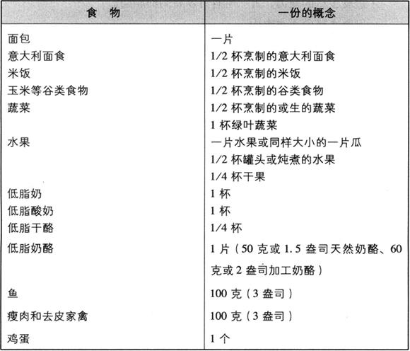 图2-3 食物金字塔表——每天摄入每种食物的份数 表2-4 食物金字塔表中一份食物的概念