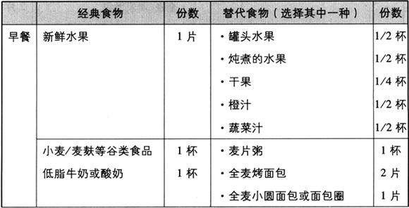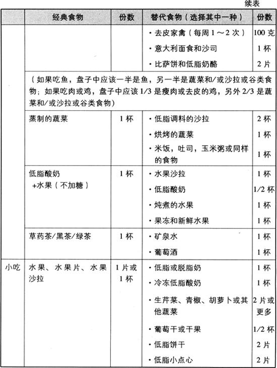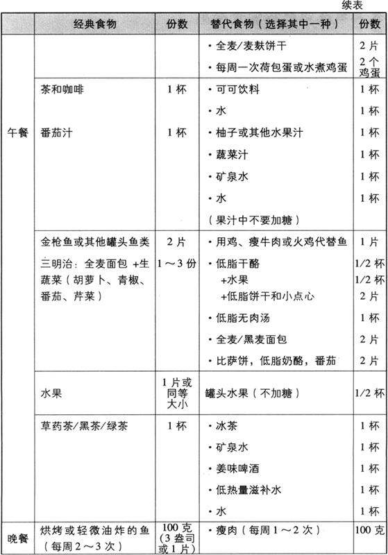 食物金字塔表是非常好的饮食指南,我们还可以根据新的研究进展对它做适当的调整。最新研究认为,蔬菜具有最重要的抗癌和保护作用,其次是水果,然后是谷类食物如意大利面食和米饭、面包、玉米、麦片等。鱼也越来越受到重视,它可能对某些癌症具有预防作用。最好食用低脂或脱脂的奶制品,可以吃少量的瘦肉和去皮家禽。 建立癌症预防饮食备志录 备忘录是一个灵活的饮食指南,表中的食物可以用同类型食物代替,其中每一份食物也和前面所定义的一致。 为了使食物更加美味可以添加一些调味品,但注意不要加太多的盐。 每日三餐都非常重要,要养成吃早饭的习惯,因为早饭一般都是全植物食品。 享受美味食品也很重要。 表2-5提供了一个非常详细、有效的癌症预防饮食备忘录,这个备忘录同样也有助于预防心脏病、Ⅱ型糖尿病和保持良好的精力和健康状况。 表2-5 癌症预防饮食备忘录