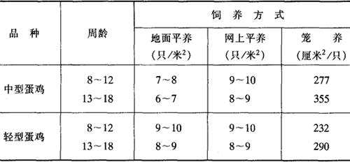 饲养密度要适中,密度过大,鸡群拥挤,采食不均,造成整齐度差。密度小,不经济,不保温。育成期各种饲养方式的合理饲养密度如表8-1。