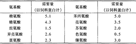 | 释义 | 饲料与投喂 (一)饲料 斑点叉尾鮰5~6厘米以下时偏食浮游动物,如轮虫、枝角类等,故可用我国传统的肥水下塘法进行苗种培育。5~6厘米后开始转入杂食性,以有机碎屑为主;精养情况下则完全依赖于配合饲料。因此,根据斑点叉尾鮰对各种营养物质的要求制定出科学的配方是养殖成败的关键。 1.蛋白质需要量及必需氨基酸 所谓蛋白质需要量是指能满足鱼类氨基酸需求并获得最佳生长的最少蛋白质含量。斑点叉尾鮰幼体阶段(8~50克)适宜饲料的蛋白质需要量为35%~41%,50克以上的个体适宜的饲料蛋白质需要量为25%~35%。斑点叉尾鮰的必需氨基酸同其他鱼类一样均为10种,其名称及需要量见表3-3。 表3-3 斑点叉尾鮰10种必需氨基酸需要量(%)