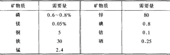 2.能量 能量是动物维持生存、生长发育的重要基础,在鱼饲料中衡量能量的指标通常以可消化蛋白(DP)和消化能(DE)的比值即蛋能比进行,理想的斑点叉尾鮰的DP/DE值为85~114,幼体阶段比值较高。当饲料能量相对蛋白质含量不足时,饲料蛋白不是用于鱼的生长,而是被转化成能量来维持生存;反之,饲料中能量过高会降低鱼的摄食量及其他重要物质的摄入,造成体内脂肪的积累。 3.矿物质 鱼类对矿物质的需求部分通过鳃从体外水环境中吸收,主要从饲料中摄取。矿物质的主要功能为参与骨骼形成,是激素和酶的重要组成部分,还能调节渗透压及酸碱平衡。斑点叉尾鮰对各种矿物质的需要量见表3-4。 表3-4 斑点叉尾鮰对矿物质需要量(毫克/千克)