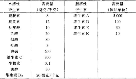 4.维生素 维生素在动物体内需要量甚微,但是动物体内不可缺少的重要成分,对维持正常生长、代谢、繁殖,参与体内酶的形成等具有举足轻重的作用。斑点叉尾鮰对各种维生素的需要量见表3-5。 表3-5 斑点叉尾鮰对各种维生素的需要量