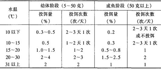 注:预混料含多种维生素、复合矿物盐、黏合剂等。 (二)投喂原则和技术 1.投喂原则 坚持投饵“四定”。即定人、定点:每人每天固定投喂相同位置,边喂边观察鱼的摄食和活动情况;定质:保证饲料成分全面,饲料新鲜,无霉变,无异味,颗粒适口,粉末少;定时、定量:斑点叉尾鮰属有胃鱼,正常情况下每次摄食量可达体重1%~2%,食物从摄入体内到排出需6~8小时,每天坚持同一时间投喂能促进食欲,保证鱼体内相关消化酶同时达到最高值,以提高饲料消化率。成鱼阶段两餐间距8~10小时,鱼种阶段每餐间距5~6小时(表3-7)。 表3-7 斑点叉尾鮰投饵情况