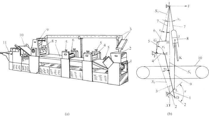 图3-3-3 摇摆式饼干机 (a)外形图 1-头道辊 2-面斗 3-回头机 4-一、二道辊 5-辊距调整手轮 6-三道辊 7-面带输送带 8-冲印成形机构 9-机架 10-拣分输送带 11-生坯输送带 (b)冲印成形机构示意图 1-冲印曲柄 2-摇摆曲柄 3、6、9-连杆 4、5、7-摆杆 8-印模头滑块 10-面坯水平输送带 K-冲头顶点 C、D、E、F、G、H、I、J、L-连杆铰接点 3.工作原理 首先将调制好的面团引入饼干机的轧片部分,经三道轧辊辊压成规定厚度的面带,然后由输送带送至成形部分。冲印成形机构是由一组曲柄连杆机构、一组双摇杆机构及一组曲柄摇杆机构组成[见图3-3-3(b)]。工作时,印模冲印曲柄1及印模摇摆曲柄2同时转动。印模冲印曲柄1通过连杆9驱动印模滑块在摆杆7的导槽内做直线往复运动,曲柄2则借助于连杆3、6和摆杆4、5使印模摆杆7摆动,从而使印模在做直线冲印时,随输送带同步运动,完成同步摇摆冲印,把面带制成带有花纹的饼干生坯和余料。随后,生坯和余料经拣分机构分离,饼坯由输送带送出,余料则由拣分输送带返回饼干机前端的料斗内。 4.机构特点 该机是利用上下模同时做相对冲压,并以近似于帆布输送带运动的线速度同向摆动,使输送带在运动过程中连续完成冲印成形,是一种连续式的冲印成形机。 5.技术特征