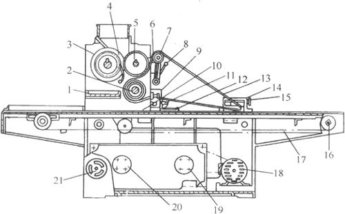 图3-3-4 辊印饼干机结构简图 1-接料盘 2-脱模辊 3-喂料辊 4-分离刮刀 5-印模辊 6-间隙调节手轮 7-张紧轮 8、15-手柄 9-手轮 10-机架 11-刮刀 12-接屑盘 13-脱膜带 14-尾座 16-输送带托辊 17-生坯输送带 18-电动机 19-减速器 20-无级变速器 21-调速手轮 3.工作原理 该机工作时,面团由料斗滑向喂料辊,随着喂料辊的旋转,被压入印模辊的印模中,并由分离刮刀将印模外多余的面料沿印模辊切线方向刮落至面屑接盘中。印模辊继续旋转,印模内的饼坯受到帆布带的吸附作用,从凹模中脱出,粘附在帆布带上,形成所需形状的饼坯。图3-3-5所示为成形脱模原理示意图。